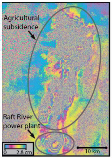 Wrapped interferogram from 8 December 2006 to 3 September 2010 showing subsidence in the Raft River Valley, ID, related to groundwater pumping for agricultural use near Burley, ID [], and both uplift and subsidence at the Raft River geothermal power plant [].