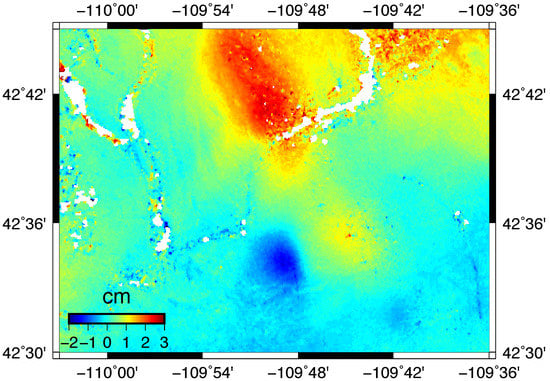 The Raft River Valley in Idaho is an area of agricultural development and the site of a recently renovated geothermal power plant near the southern end. Long-term subsidence in the valley due to ground water pumping was first reported in a study of releveling data by Lofgren [] and deformation related to the geothermal power plant detected by InSAR is described by Ali et al. []. Interferograms from two overlapping tracks show the subsidence to be on the order of 2 cm/yr in the radar LOS during 2005–2010 (Figure 9). These tracks also show uplift and subsidence at the Raft River Valley geothermal power plant that began around the time the plant started commercial operation in 2008 []. The largest signal is a circular-shaped lobe of uplift which has a maximum rate of −2 cm/yr in the radar LOS. A smaller oblong-shaped subsidence lobe, sinking at a maximum rate of 1 cm/yr in the radar LOS, is adjacent to the uplift. Both the uplift and subsidence appear to decrease in rate over time.