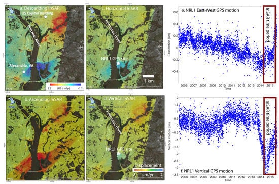 InSAR data near Washington, DC, from CSK and processed by TRE Canada using the SqueeSAR technique for a collaborative project with the University of Virginia and the Virginia Department of Transportation funded by the United States Department Of Transportation [,]. (a) Time series from 28 descending CSK SAR acquisitions spanning from March 2014 to June 2015 where blue indicates movement toward the satellite (e.g., uplift and/or eastward motion). (b) Time series from 40 ascending CSK SAR images spanning from February 2013 to August 2015. The average displacement rate standard deviation for all measurement points for the descending dataset (which characterizes the error of the measurements) was calculated to be ±0.23 cm/yr, and should be smaller for the ascending dataset since it contains more dates. These two tracks were combined to decompose the east–west (c) and vertical motion (d) in the common time period (March 2014 to June 2015) shown as a red box in (e,f). Subsidence is observed in the northeast part of the image, while an unusual combination of mostly east–west (e) and some uplift (f) is seen near the Naval Research Lab GPS site (NRL1) during the time period when the InSAR deformation was observed. Global positioning system (GPS) displacements are with respect to the NA12 reference frame [] and were processed by the University of Nevada, Reno (e.g., []).
