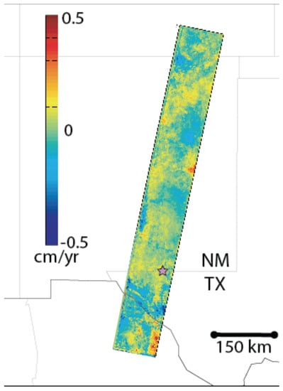 Leveling data between 1934 and 1977 showed uplift of up to 19 ± 3 cm over an area spanning 120 km in the EW direction in the Diablo Plateau-Salt Basin region of west Texas as well as a ∼20-km wide subsidence signal of −4.3 ± 0.3 cm between 1958 and 1977 []. The cause of the deformation was not known, but Reilinger et al. [] suggested that the uplift signal could be from tectonic or magmatic effects, while the subsidence might be from groundwater pumping. No ground deformation was detectable by InSAR in the area between 1992 and 2001 (Figure 14), but we can make no statement on the deformation during the earlier time period. Further, if uplift is still occurring at the rate detected by the leveling data decades ago (i.e., ∼0.04 cm/yr), the signal would be hard to detect with available InSAR.