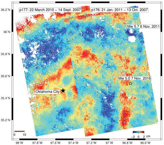 Several studies have shown that a recent increase in wastewater re-injection in Oklahoma and other places has likely induced earthquakes in several parts of the state (e.g., []), but our ALOS-1 observations between 2006 and 2011 do not show any clear ground deformation from the injection (Figure 15). Further research is needed to determine the reason for the lack of detection. The relatively short ALOS-1 data archive may simply be not sensitive enough to detect the ground deformation—we estimate the precision of our measurements in this active agricultural area to be 3–4 cm/yr, which is in line with estimates of ALOS-1 time series precision in other areas (0.5–0.8 cm/yr in New Zealand [], 0.5 cm/yr in Colorado [], 2.4 cm/yr in Central America [], 2 cm/yr in Mexico and Indonesia [] and ∼2.5 cm/yr in Java []. The low level of ground deformation could be due to characteristics of the groundwater pumping or subsurface geology in Oklahoma (e.g., deep injection in very porous rock overlain by very rigid layers). For example, InSAR time series analysis of ALOS-1 observations in the Raton Basin in Colorado and New Mexico did not detect any uplift from wastewater re-injection above the detection threshold of 0.5 cm/yr, possibly because of the depth of injection (1.12–2.2 km), but did allow detection of ground subsidence (Table S1 []). Alternatively, the time period of ALOS-1 observations (fromlate 2006 to early 2011) also may not have overlapped with the period of highest activity and associated ground deformation—the number of earthquakes in Oklahoma increased from 41 in 2010 (when our observations end) to 903 in 2015 according to the Oklahoma Geological Survey.