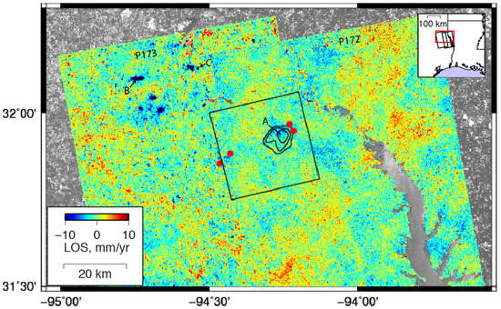 Secular rate from ALOS-1 time series (color) in eastern TX, where Shirzaei et al. [] analyzed a subset of the area (black box) covered by two frames and reported ground uplift (black contours) associated with wastewater injection at several sites (red dots). Blue indicates shortening of the satellite LOS (e.g., uplift) in mm/yr, and we did not find a clear uplift signal above background in the area reported by Shirzaei et al. []. Note much larger signals to the northwest of the earlier study—these have magnitudes of −2 to −5 cm/yr. Letters and arrows indicate the location of the time series in Figure 17.