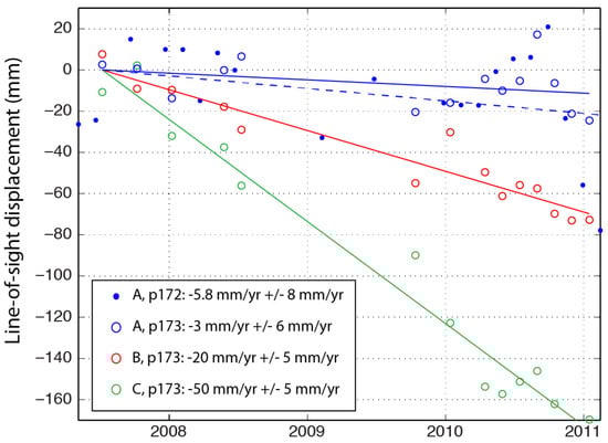 Our results involved processing the data over a larger spatial area and similar time interval (January 2007 to January 2011) but we explore using both the full dataset and the subset of dates used in Shirzaei et al. []—they used only 10 of the 20 dates for path 172 and 8 out of 15 dates for path 173. We find that processing the InSAR time series in the areas immediately surrounding the study area of Shirzaei et al. [] (extent shown in Figure 16) is key for evaluation of the robustness of the signal. Regions with apparent deformation signals similar to those inferred for the area of the study in Shirzaei et al. [] are present throughout the entire region, supporting the idea that signals of this size are related to atmospheric noise. Interestingly, to the immediate northwest of the area examined in Shirzaei et al. [], several very clear uplift signals are present with magnitudes of >10 cm/yr and spatial scales of 5–10 km. These signals can be clearly seen in maps of the average secular rate (Figure 16) as well as in the relationship between displacement and time that we infer at individual points from the suite of interferograms (Figure 17)—they are also apparent in independent interferograms (not shown here). Shirzaei et al. [] also show interferograms from the Radarsat-2 satellite covering a different time period (March to August 2014) with uplift rates of up to −0.9 cm/yr and a different spatial pattern. Since we do not have access to this data, and no estimate of detection threshold is provided, we cannot assess the robustness of the Radarsat-2 signal.