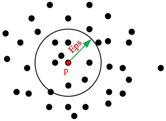 - Eps neighboring area: let be the center of a sphere in the dataset . For data within the radius of the object’s area, a collection of points contained in the sphere is . A definition diagram is shown in Figure 1.