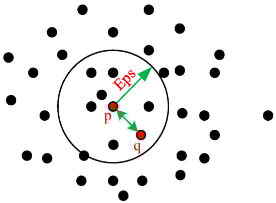 Let the dataset to be processed be denoted as D, the algorithm’s clustering radius, , and the minimum number of objects in the neighborhood, MinPts. Then, the following are some basic concepts of the algorithm []: