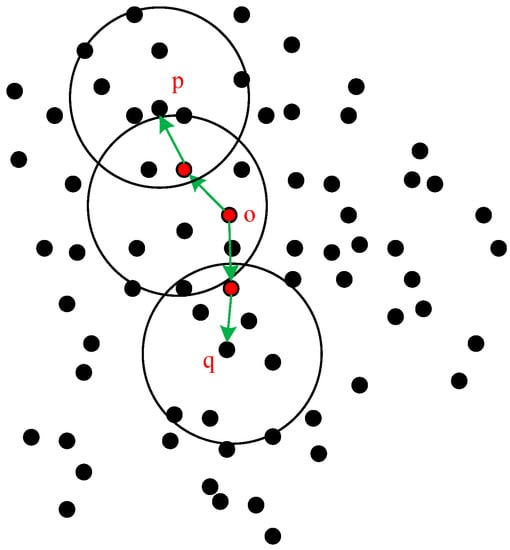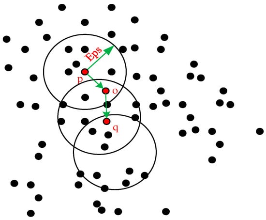 - Direct density-reachable: given objects , where there is a core point and this is inside the neighborhood of , it is said that from to is direct density-reachable, i.e., , , as shown in Figure 2.