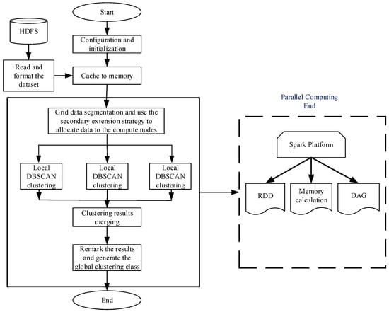 The principle of the parallel algorithm adopted this strategy is described as follows (Figure 5): (1) The formatted dataset from the HDFS is read and cached into the memory. (2) Based on the computation of the RDD, Spark’s memory capabilities, and the properties of directed acyclical graphs (DAG), the dataset is divided into computing nodes in order to perform local partition-clustering operations according to the above-mentioned strategy. (3) Each partition performs local clustering operations in parallel. (4) After the local data-clustering is complete, the clustering results are merged. (5) Finally, the merged results are re-marked, and then the global clusters are generated. A flowchart of these procedures is shown in Figure 5, where it is found that the parallel algorithm has four important stages: (1) data partitioning; (2) local clustering; (3) data merging; and (4) global clustering generation.