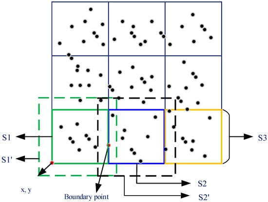 In this paper, the mesh and the secondary extended partition strategy was adopted [] to parallelize the DBSCAN algorithm. After data partitioning using this strategy, the data was divided into local and border areas, and the data points were marked. All points in the boundary area were included in multiple local areas, thus providing the conditions for the later cluster-merging procedure. Additionally, this strategy solved the problem whereby the same point is divided into different clustering classes during the clustering procedure.