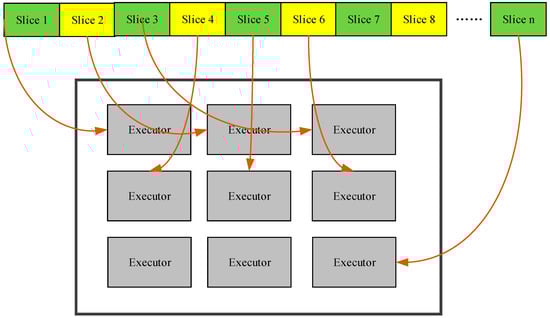 At this stage, any data slices that have been segmented in the final step of the first stage are then distributed to the executor via the task scheduler for local DBSCAN clustering calculations. The process is demonstrated in Figure 9.