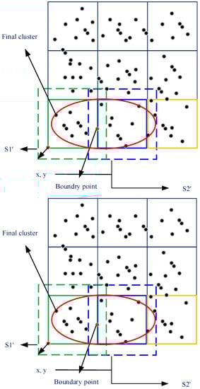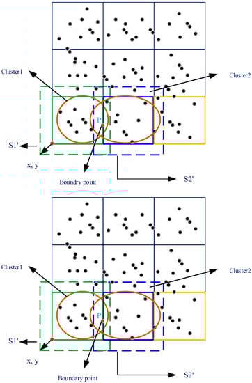 In Figure 6, i.e., the data partitioning procedure, allocating points that belong to the same cluster to different nodes is unavoidable; that is, the attribution problem of the boundary points resulting from the data division appears. However, these boundary points are essential to the following cluster-merging process. Therefore, the secondary slice expansion technique was adapted with the first data-partitioning operation.