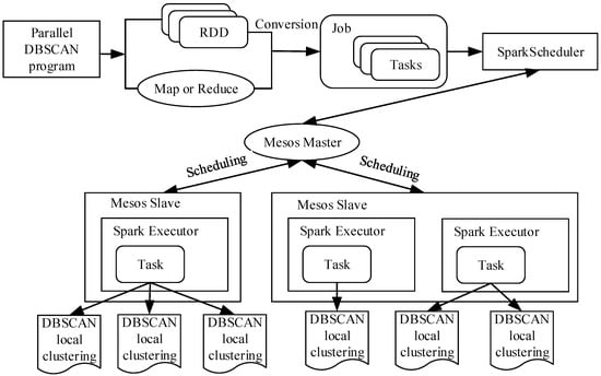 - Parallelization on Cloud-computing platforms. Dean et al. proposed to take advantage of MapReduce, a large-scale data processing programming model, to enhance the processing efficiency []. Böse et al. designed data-mining algorithms based on the MapReduce programming framework, and they demonstrated the feasibility of adopting the MapReduce programming model in data mining []. He et al. implemented the MR-DBSCAN algorithm with MapReduce, and achieved good scalability and speedup []. Dai et al. divided the data by reducing the number of boundary points, and they used KD-Tree spatial indices to parallelize DBSCAN on Hadoop to improve the performance of the algorithm []. Fu et al. studied the parallel DBSCAN clustering algorithm based on Hadoop. The experimental results demonstrated that the proposed algorithm could efficiently process large datasets on commodity hardware and have good scalability []. In addition, some researchers studied the parallel implementation of K-Means algorithm on Hadoop to improve the efficiency [,]. In these studies, the efficiency of the parallel algorithms were improved on Hadoop, but the results were less than ideal when processing massive spatial datasets [,,]. The reasons for this were: (1) the startup time in MapReduce increased the overall run time of the jobs; (2) the frequent I/O carried out by the Hadoop distributed file system (HDFS) for the intermediate results, due to its fault-tolerance mechanism; and (3) with an increase in the data size, the processing efficiency was significantly decreased [].