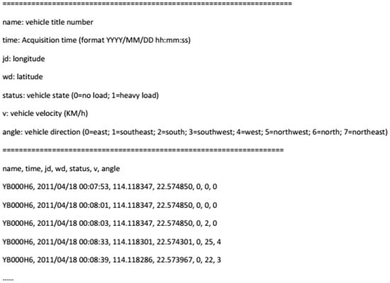 After selecting the above GPS trajectory data, a pre-processing process was used to remove wild values, e.g., (1) GPS geographical location data that exceeded the geographic location of Shenzhen, (2) acquisition data obtained for time periods between 00:00 and 06:00, (3) repeated data points, etc. The GPS data format after pre-processing is demonstrated in Table 11.