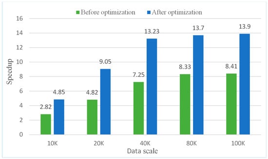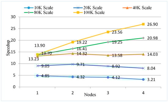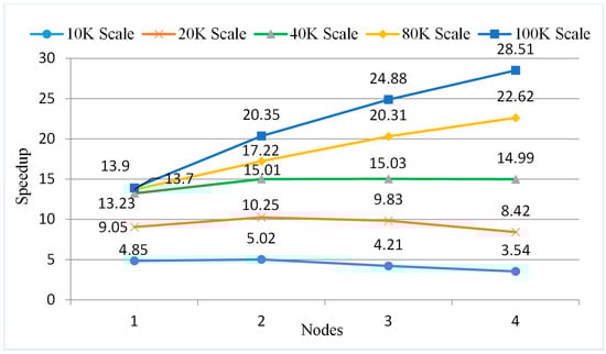 From Table 15, it can be seen that when the data scale was 2000 K, the elapsed time of the serial algorithm was 13 h, which cannot satisfy real-time requirements. Compared with the serial algorithm, the parallel algorithm processing time was 0.4 h. The obtained speedup ratio is 32, which indicates that the parallel algorithm can effectively improve processing efficiency. When the spatial data scale reached 4000 K, the single-node method failed; however, the parallel algorithm’s processing time was 2.2 h.