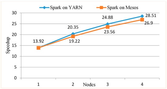 From Figure 22, it can be seen that Yarn shows better performance, and is more suitable than Mesos for applications with more iterations. The reason for this is that the Yarn resource manager is able to deal with the dynamic distribution of resources according to the application requirements when dealing with algorithms with multiple iterations. As a result, Yarn can make full use of the computing capability of the Spark cluster platform.