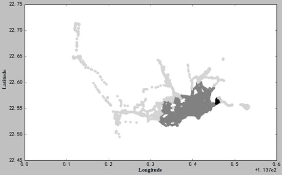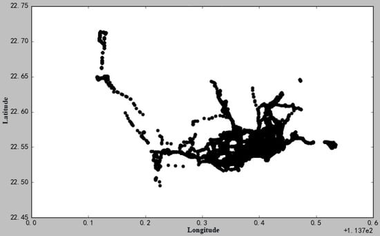 After the pre-processing process, the data was processed a second time. In this process, we simplified the data, extracting only the latitude and longitude information of the taxi from the pre-processed data. Then, the spatial data was included in the cluster operation using the DBSCAN algorithm following extraction of the latitude and longitude information of the taxi from the pre-processed data. The format of the processed GPS tracking data (here using the car YB000H6 as an example) is shown in Table 12, while a visualization of the taxi trajectory distribution before the clustering is shown in Figure 24.
