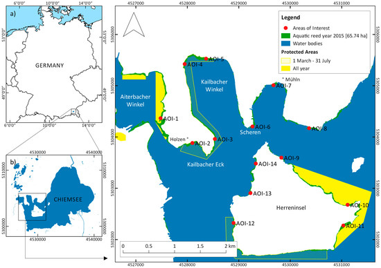 The Chiemsee is the largest lake in Bavaria (80 km2) with a maximum depth of 73 m and a volume of 2048 hm3 [34]. It is located approximately 80 km southeast of Munich at an approximate altitude of 518 m above sea level (m.a.s.l.). During the last five decades, the spatial extent of the reed population has declined by about 50% at the Chiemsee [2]. Substantial reed beds at the Chiemsee are still existent and their decrease has been well documented which was why this lake was selected for our study. On the northwest side of the Chiemsee and at the Herreninsel, the most representative stocks of aquatic reed are still present [21]. Through an analysis of previous surveyed data, field observations, distribution stocks, and of water depth, the areas of interest (AOI) were selected for gathering validation data. The actual density of reed stems obtained from field observation was also considered. A total number of 14 AOIs with the occurrence of Phragmites australis at a mean area of 1694 m2 (100 m in length at varying width) were selected for this study. AOIs were delimited at Aiterbacher Winkel (AOI-1), at the shores of Holzen (AOI-2,) at Keilbacher Eck (AOI-3), in Kailbacher Winkel (AOI-4 and -5), at Scheren (AOI-6), at the shores of town Mühln (AOI-7 and -8), and at Herreninsel (AOI-9, -10, -11, -12, -13, -14). In order to consider the variability of vegetation status, AOIs were selected in areas of different levels of protection: (a) protected all year long, (b) protected only during the avian breeding season, and (c) in areas without any form of environmental protection (Figure 1).