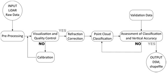 The analysis and classification of Airborne Laser Scanning (ALS) datasets was performed with the modular program system OPALS 2.2.0.0 [35]. The software provides modules for a complete processing chain of ALS data. Pre-processed LiDAR point clouds were imported into the OPALS data manager and the quality was assessed according to strip adjustment and outliers (noise). According to the information obtained from the quality control, no further calibration (e.g., strip adjustment, geometry calibration) was needed. Point cloud classification was then performed, and raster and vector file results were compared to field data and aerial imagery (Figure 2).