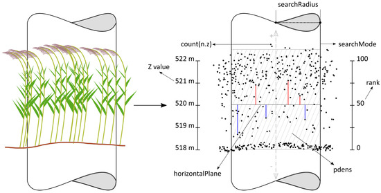Statistical parameters for LiDAR point clouds were calculated for describing point attributes with the module opalsPointStats. OPALS calculates statistical features by first selecting points and then relating them to a reference model. The selection of points was based on an infinite vertical cylinder (searchMode = d2); the reference model was a “horizontalPlane”. Since the laser footprint at ground level was around 0.4 m in diameter, the cylinder radius (searchRadius) was set to 0.2 m for the majority of calculations. In the model “horizontalPlane”, the samples were reduced in relation to a plane passing through the feature point. Calculated statistics for identifying patterns in point clouds were ranked (rank) and point density (pdens). Rank statistic was calculated as the relative position (0 = local minimum and 100 = local maximum) of the feature point within its vertical neighbourhood. The feature pdens is the number of points in relation to the area/volume of the search cylinder. Since the usual measurement units for point density is points/m2, a cylinder searchMode with a searchRadius of 0.5 m was selected as the most proximate value to a square meter (Figure 3). Filtering was crucial for the classification, since it allowed for points to be defined when a new attribute had to be calculated (processing filtering) in relation to the local neighbourhood (neighbourhood filtering). The classification was performed with the module opalsAddInfo. In order to define the threshold values, point clouds were inspected through cross-sections every metre with the module opalsSection. Special attention was placed on spatial distribution, density, and intensity of points. Cross-sections revealed that height and vertical distribution of points are important factors to differentiate dense and sparse reed beds.
