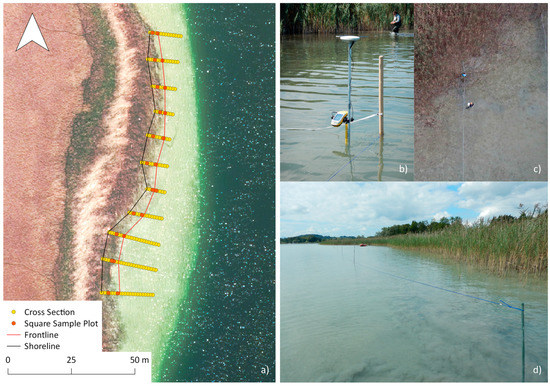 Collection of Reference Points (RPs) as an example of AOI-3. Background is an orthorectified aerial photograph in true colour of the Landesamt für Digitalisierung, Breitband und Vermessung (LDBV), 2015 (a). Differential Global Positioning System (DGPS) Trimble GeoXT and an antenna Hurricane L1 used for georeferencing RPs (b). Aerial view of square transect measurements along a cross-section (c). One-hundred metre line parallel to the shore with 10 m sections (d).