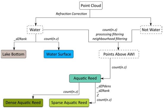 Graphical representation of methods and statistics used for classifying aquatic reeds in point clouds obtained from Green-Light Detection and Ranging (LiDAR).