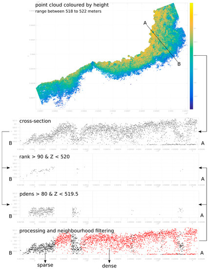 Classification of Sparse Aquatic Reed beds according to stem height below 2 m (rank), density of points under a height of 1.50 m (pdens), and in combination with processing and neighbourhood filtering. Grey colours represent to unclassified points, and black and red to areas of sparse and dense aquatic reeds, respectively.