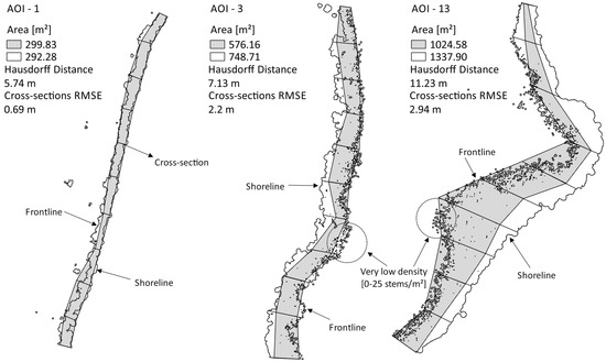 Extents of aquatic reed beds were evaluated based on two criteria. First, the extents derived from LiDAR data for every AOI were compared with the ones obtained from field measurements, by means of correlation analysis. Since measured and derived surfaces can have the same extents but different shapes, the correlation analysis of the extents was complemented by an assessment of geometrical similarity. As a second criterion, the separation distance of two geometrical objects (polygons) in a metric space was measured (Hausdorff Distance Pairwise). The smaller the resulting value, the more similar the geometrical shapes are [38]. In addition and to support this last metric, the Root Mean Squared Error (RMSE) of the lengths of cross-sections measured on the field in relation to the lengths obtained from LiDAR data was assessed.
