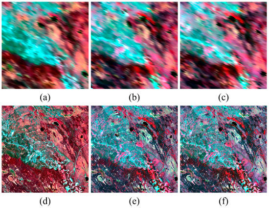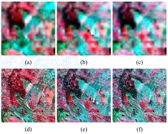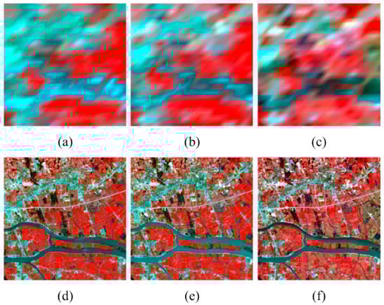 Near-infrared (NIR)–green–blue composites of the simulated-MODIS imagery (upper row) and Landsat imagery (lower row) taken on (a,d) 24 May 2001, (b,e) 11 July 2001, and (c,f) 12 August 2001, respectively.