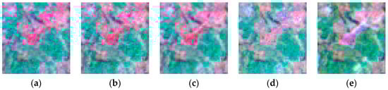 The (a) actual image acquired on 11 July 2001 and its predictions by (b) STBDF-I (Spatio-Temporal Bayesian Data Fusion I), (c) STBDF-II, (d) STARFM (Spatial and Temporal Adaptive Reflectance Fusion Model), and (e) ESTARFM (enhanced STARFM).