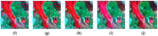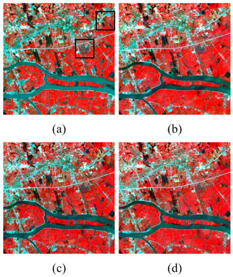 Figure 3 shows the reference image on 11 July 2001 and the predicted ones by STARFM, ESTARFM, STBDF-I, and STBDF-II, respectively. It is clear that all four algorithms have good performance in capturing the main reflectance changes over time. STARFM performs almost equally well with ESTARFM. STBDF-I and -II are better in capturing the reflectance changes and fine spatial details of small parcels, and in identifying objects with sharp edges and bright colors. The images predicted by STBDF-I and -II seem to be more similar to the reference image and maintain more spatial details than those obtained by STARFM and ESTARFM. Their differences are highlighted in the zoomed-in images shown in Figure 4. Clear shapes and distinct textures can be found in the results of our algorithms (Figure 4b,c), while the shapes are blurry and some spatial details are missing in the results of STARFM and ESTARFM (Figure 4d,e); the shapes are even difficult to identify in Figure 4d. For the second set of the zoomed-in images (Figure 4f–j), the color of the images obtained from our algorithms (Figure 4g,h) are closer to the reference image (Figure 4f) than the results of STARFM and ESTARFM (Figure 4i,j), respectively, which are distorted. The red color in the result of STARFM (Figure 4i) turns out to be a little bit pink and the green color in the result of ESTARFM (Figure 4j) looks greener than in the reference image (Figure 4f).