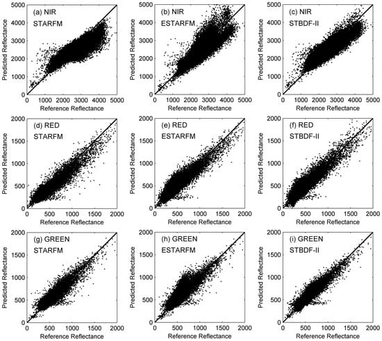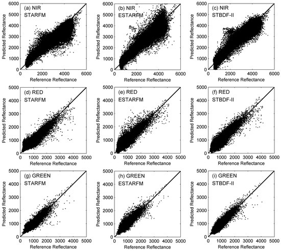 Scatter plots of the predicted reflectance against the actual reflectance. (a–c) Scatter plots of the predicted reflectance using STARFM, ESTARFM, and STBDF-II against the actual reflectance in the NIR band, respectively; (d–f) the red band; (g–i) the green band.