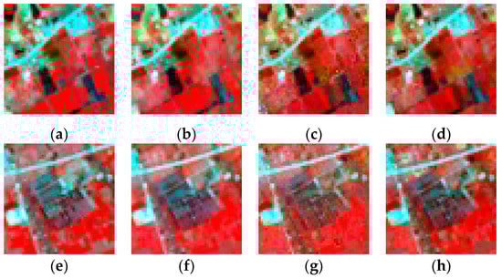 Figure 9 depicts the reference Landsat image and the three predicted images from STARFM, ESTARFM, and STBDF-II, respectively. The three algorithms are all capable of predicting the target image by capturing many spatial details. It appears that colors of the image predicted by STBDF-II are visually more similar to the reference image in terms of better hue and saturation than those by STARFM and ESTARFM. Moreover, STBDF-II captures almost all the spatial details and fine textures in the reference image, while STARFM and ESTARFM fail to maintain some details. To highlight the visual difference in Figure 9, we give two sets of zoomed-in images as illustrated in Figure 10 with respect to the two black boxes shown in Figure 9. As shown in the first set of the zoomed-in images (Figure 10a–d), the colors and the shapes of vegetation patches in the image generated by STBDF-II (Figure 10b) is closer to the reference image (Figure 10a) than those by STARFM and ESTARFM (Figure 10c,d). Some pixels produced by STARFM and ESTARFM seem to have abnormal values, leading to a visually brown color in several patches. From the second set of the zoomed-in images (Figure 10e–h), it is clear that the shapes of the buildings predicted by STBDF-II (Figure 10f) are more similar to those in the reference image (Figure 10e). The buildings (in blue color) in the middle of the predicted images by STARFM and ESTARFM (Figure 10g,h) seem to lose some spatial details and shapes with blurry boundaries. Figure 11 shows the scatter plots of the predicted reflectance against the reference reflectance in the NIR, red, and green bands, respectively. Results of the quantitative measures are summarized in Table 4. STBDF-II achieves the best results, except for the AAD and RMSE values for the red band that are, however, very close to those of the other two algorithms (STARFM produces a slightly better result). Nevertheless, the ERGAS values in Table 4 indicate that the fusion quality of STBDF-II outperforms those of STARFM and ESTARFM from a synthetic perspective.