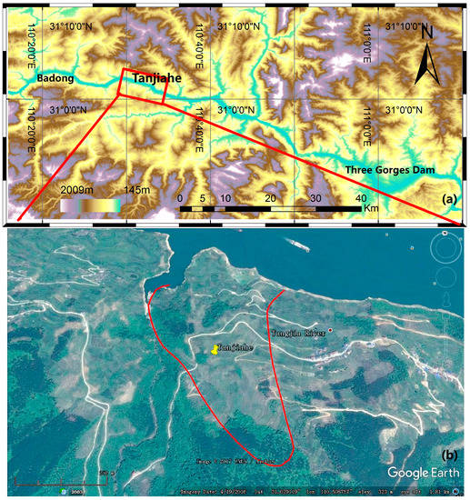 (a) Location of Tanjiahe landslide area shown in SRTM DEM. (b) Tanjiahe landslide area shown in Google Earth with landslide body highlighted in red. Map data: Google Earth, Image@ 2017 CNES/Airbus.