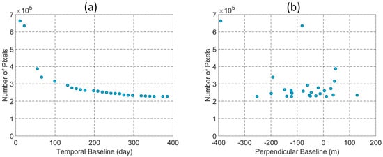 (a) Number of reliable measurements in the stable area plotted in relation to the temporal baseline; (b) Number of reliable measurements in the stable area plotted in relation to the perpendicular baseline.