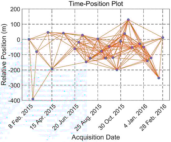 A temporal baseline of 99 days and a perpendicular baseline of 400 m are selected as constraints to construct a small baseline network. In total, 157 offset pairs are connected, with a mean connection redundancy of 5.6 per acquisition. The resulting small baseline network is shown in Figure 4, with the relative position (perpendicular baseline with respect to the first acquisition on 8 February 2015) plotted versus the temporal baseline.