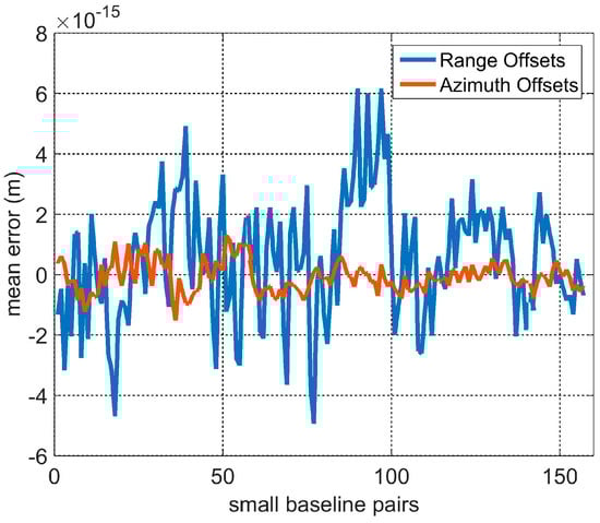 Mean errors of the range and azimuth offsets measured from the stable area of all 157 pairs after residual removal.