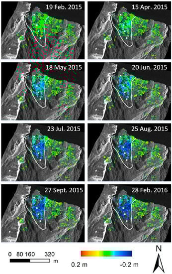 From both the azimuth and range offset maps shown in Figure 6 and Figure 7, the whole landslide body shows consistent pattern of temporal evolution, i.e., the slope experienced biggest displacement rate in April–August and tend to be stable in the following months. The spatial distribution of the landslide is also clear. The upper part of the slope shows bigger deformation magnitude, whilst smaller displacement rate is observed in the lower part of the landslide.
