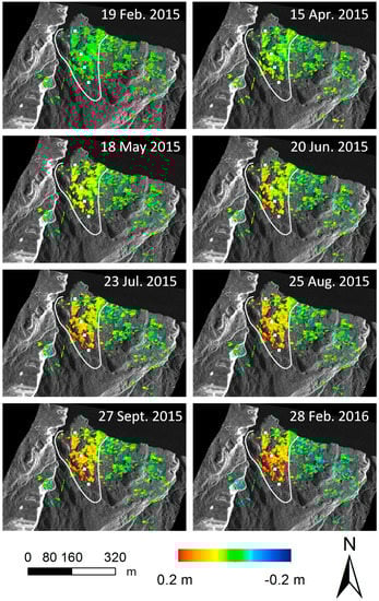 In Figure 13, heavy and intense rainfall is observed from March to October, covering the period of the greatest displacement rate (April–July 2015). However, in the period of July–October 2015 with intensity of rainfall second only to the previous months, no noticeable deformation can be observed.