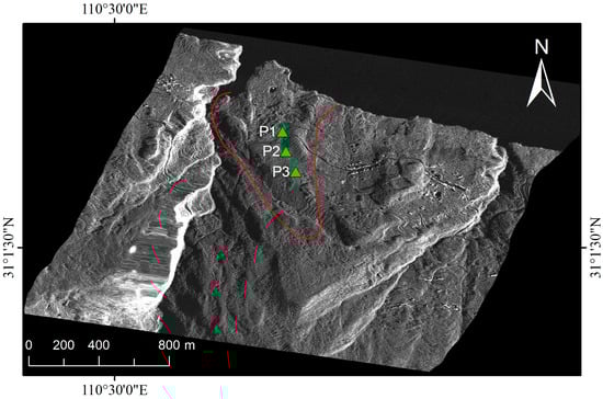 Location of the three pixels ‘P1’, ‘P2’, and ‘P3’ selected for time series analysis. The three pixels marked by green triangles and the landslide boundary in red are superimposed on the SAR amplitude image over the Tanjiahe landslide site. Data source: TerraSAR-X Staring Spotlight © DLR <2015>.