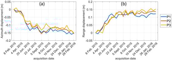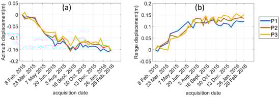 As we can see from Figure 11, the measurements from all three pixels show a consistent pattern of displacements in both the azimuth and range directions. The azimuth offset measurements of ‘P1’ are then selected for subsequent analysis in Section 4.1.