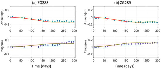 The time series of pixels located in the same area of the GPS stations are plotted against the annual displacements of individual GPS stations, as shown in Figure 10. As ZG290 and ZG287 are located out of the mask of valid pixels, the other two stations, ZG288 and ZG289, are used in the following analysis.