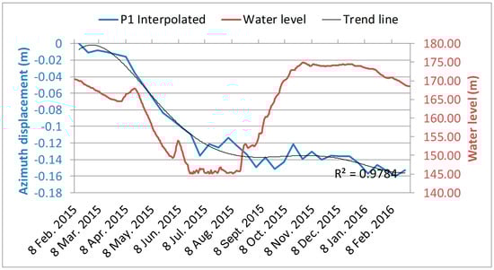 Interpolated time series azimuth displacement of P1 vs. water level measurements of the Three Gorges Reservoir in the period from 8 February 2015 to 28 February 2016.