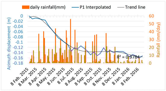 Interpolated time series azimuth displacement of P1 vs. local rainfall data in the period from 8 February 2015 to 28 February 2016.