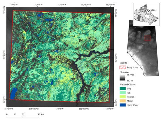 Map showing the location of the study area within northeastern Alberta, Canada, and the distribution of bogs, fens, swamp, marsh, and open water according to the Alberta Merged Wetland Inventory [28].