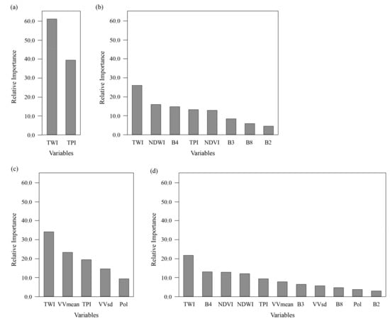 Relative variable importance for each model, averaged again over the 50 model iterations, are shown in Figure 3. Measures of relative variable importance or influence are calculated using the number of times a variable is selected for splitting within each regression tree, and the improvement this variable brings to the overall model each time it is selected [70]. In all four of our wetland probability models, TWI was the most influential predictor variable, followed by NDVI, NDWI, B4 and TPI in those models incorporating optical inputs, and by VVmean and TPI in those models incorporating SAR inputs.