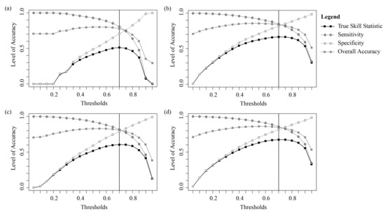 True Skill Statistic (TSS), sensitivity, and specificity values calculated and plotted over a series of probability classification thresholds for the four models: (a) Tmodel, (b) TOmodel, (c) TSmodel, and (d) TOSmodel.