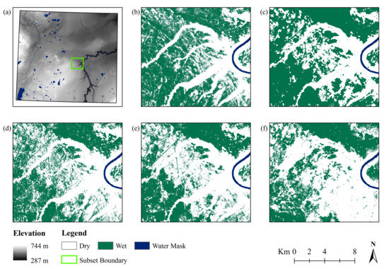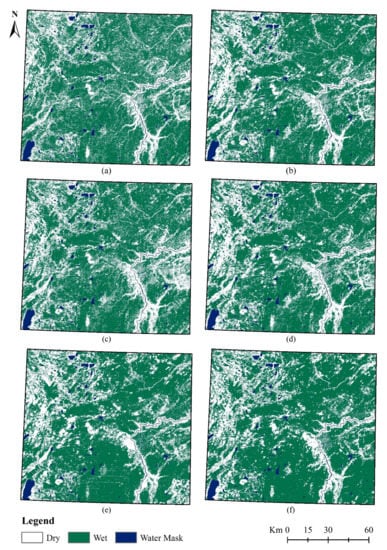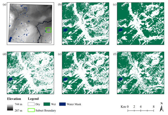 Wet vs. Dry classifications produced by thresholding at a probability of 0.7 models (a) Tmodel, (b) TOmodel, (c) TSmodel, and (d) TOSmodel. The (e) AMWI and (f) reference Alberta Vegetation Inventory (AVIE) data set are also shown.