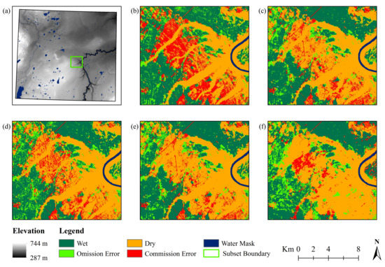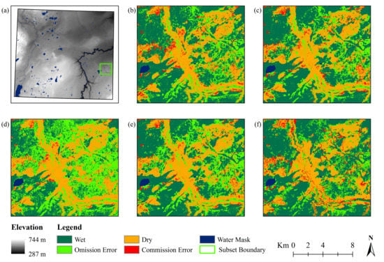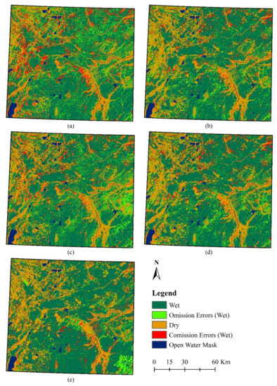 Classification errors of omission and commission, along with correctly-classified Wet and Dry class pixels, generated for the (a) Tmodel, (b) TOmodel, (c) TSmodel, and (d) TOSmodel classifications and the (e) AMWI.