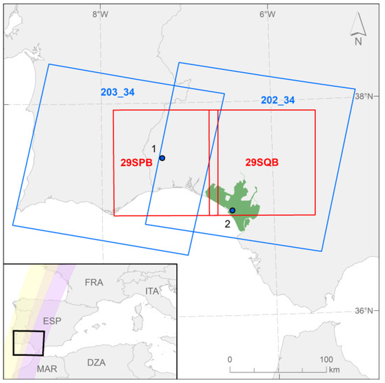 Study area: Doñana National Park in green (Spain, EU), Villanueva de los Castillejos sub-area (1), and Laguna de Santa Olalla sub-area (2). Also shown, Landsat (blue outline) [53] and Sentinel (red outline) scenes [54]. Location map in SW Europe with Sentinel-2 R037 orbit (yellow) and R137 orbit (purple).