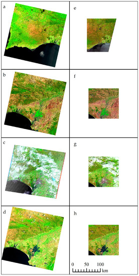 (Left) Landsat L1T images used. False color composite image (L7 RGB 543, L8 RGB 654); (a) 20 May 2016 (OLI) 203034; (b) 4 October 2016 (OLI) 202034; (c) 22 April 2017 (ETM+) 202034; (d) 1 June 2017 (OLI) 202034. (Right) Sentinel-2A L1C images used. False color composite image (S2 RGB 11·8·4); (e) 20 May 2016 T29SPB; (f) 4 October 2016 T29SQB; and, (g) 22 April 2017 T29SQB. (h) 1 June 2017 T29SQB.