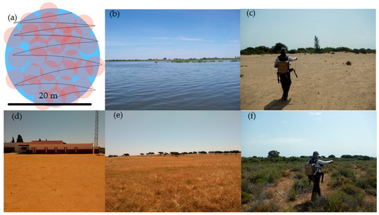 (a) Sampling footprint; (b) Shallow lake water (DG, 1 June 2017); (c) Sand dune (DG, 1 June 2017); (d) Albero (DA, 20 May 2016); (e) Grassland (DA, 20 May 2016); and, (f) Shrub (DG, 1 June 2017).